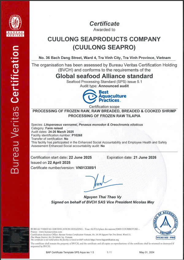 Located in the fertile Mekong Delta region of Vietnam, Cuulong Ba Tri 2 Farm is one of the company’s key tilapia farming sites, proudly certified under the BAP (Best Aquaculture Practices) standard. This certification recognizes our commitment to environmental responsibility, animal welfare, food safety, and social accountability. The farm applies a closed-loop aquaculture system that optimizes water quality, minimizes waste, and ensures sustainable growth throughout the production cycle. Each pond is monitored daily for water parameters, feed control, and fish health by a team of skilled technicians. Tilapia at Ba Tri 2 Farm are fed with BAP-approved feed sources, ensuring consistent quality, safety, and traceability. With an annual capacity of over 10,000 tons of raw material, the farm plays a vital role in Cuulong’s integrated supply chain, supplying high-quality fish to our BRC-, BSCI-, and HACCP-certified processing facilities. Through continuous improvement and strict adherence to BAP standards, Cuulong Ba Tri 2 Farm demonstrates the company’s vision of sustainable aquaculture for global excellence, delivering safe, clean, and responsibly farmed tilapia to consumers around the world.