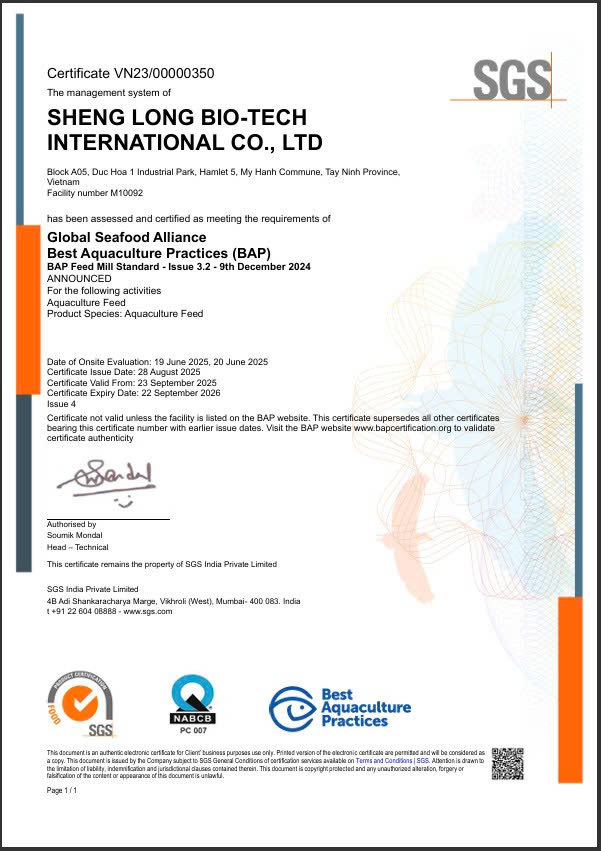 Certified BAP feed mill ensures quality and sustainable nutrition.