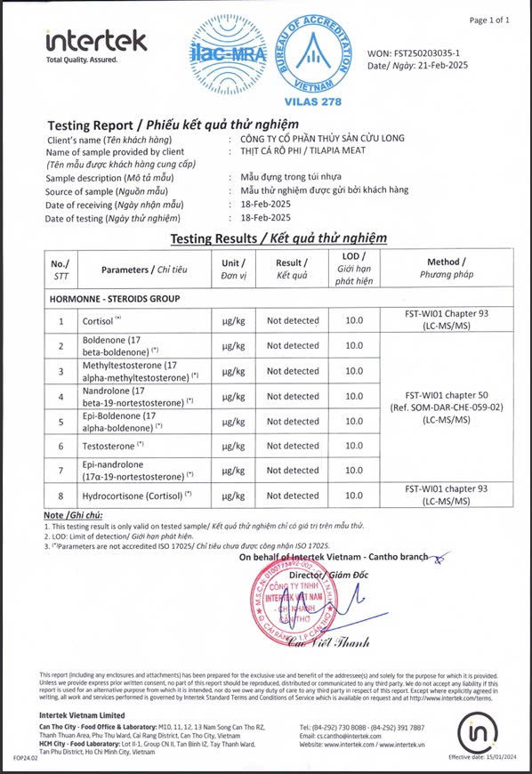 Cuulong tilapia are fed with BAP-certified feed containing 32% protein, produced with European technology to ensure natural growth and superior flesh quality